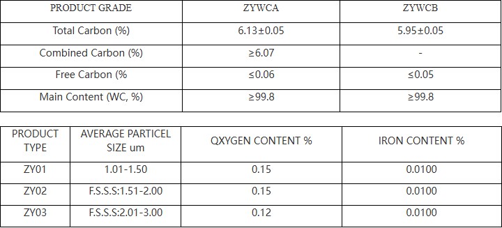Poudre de carbure de tungstène (WC) : dureté 9,5 (échelle de Mohs), densité 15,63 g/cm³, point de fusion 2 870 °C, granulométrie 0,22 à 6,00 µm (au choix), teneur en oxygène ≤ 0,25 %, teneur en fer ≤ 0,03 %. Ce matériau présente une excellente résistance à l’usure et à la corrosion et constitue une matière première essentielle pour les alliages durs.